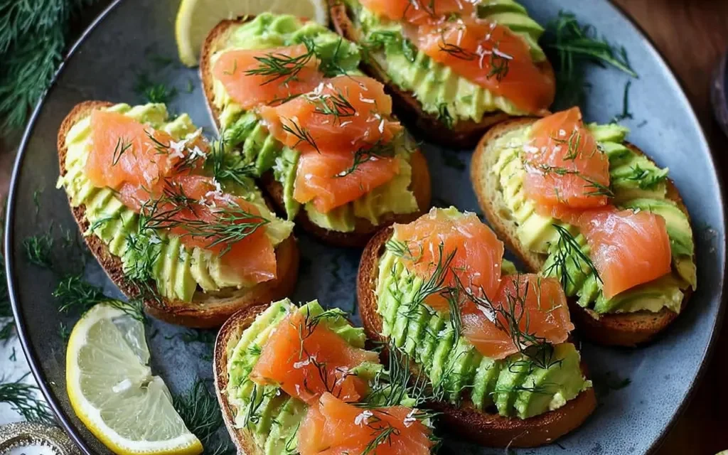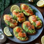 Indulge in a delightful 30-minute avocado and smoked salmon toast, featuring creamy avocado spread on crisp, golden-brown toast and topped with savory smoked salmon. This quick and easy recipe makes for a satisfying breakfast, lunch, or snack.