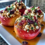 Baked apples filled with a creamy, indulgent mixture of crumbled feta, sweet honey, and tart cranberries, creating a delightful balance of flavors that’s perfect for a cozy fall dessert or elegant holiday treat.