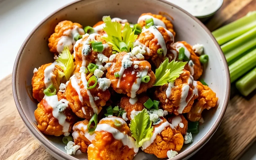 6- Serve your hot, saucy Buffalo Cauliflower Bites immediately, garnished with a sprinkle of chopped fresh parsley or chives if desired. Enjoy this irresistible snack with your favorite dipping sauces, celery sticks, and cool ranch or blue cheese dressing.