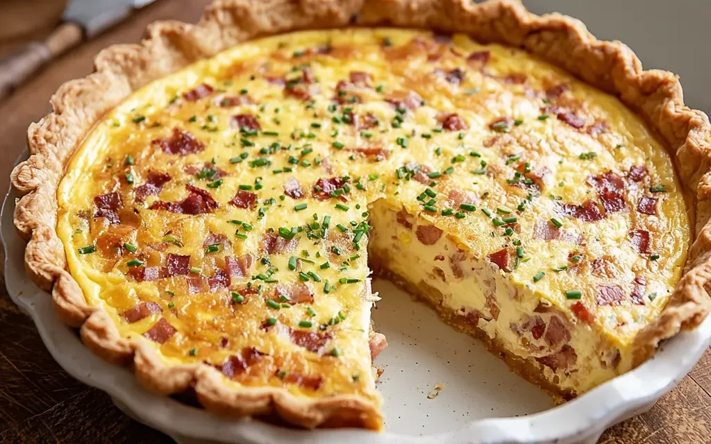 6- Remove the quiche from the oven and let it cool for 10-15 minutes before slicing and serving. This allows the filling to set up nicely. Enjoy your Classic Quiche Lorraine while it’s warm, garnished with a sprinkling of fresh chives or a light salad on the side.
