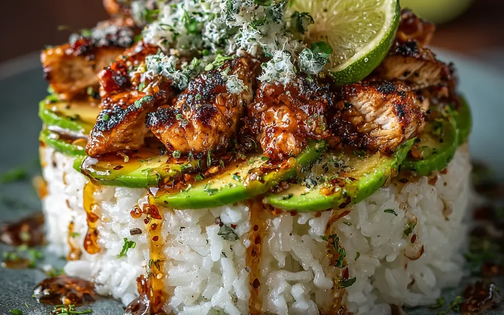 The Secret Behind Perfect Honey Lime Chicken & Avocado Rice Stack