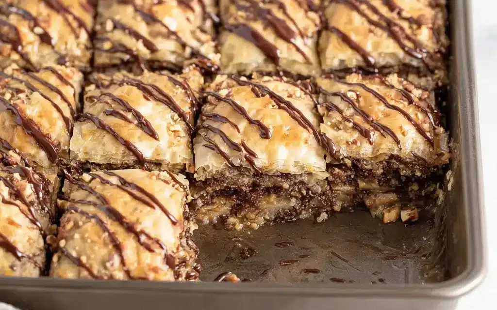For a richer flavor, you can use a combination of Nutella and chopped dark chocolate. Leftover baklava can be stored at room temperature for up to 5 days.