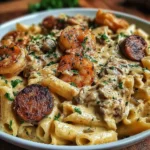 For a gluten-free version, replace the penne pasta with a gluten-free alternative, such as brown rice or quinoa pasta. To make it dairy-free, substitute the heavy cream with unsweetened almond milk or cashew cream, and omit the Parmesan cheese. For a lower-carb option, serve the Cajun shrimp and sausage mixture over riced cauliflower or zucchini noodles instead of pasta.