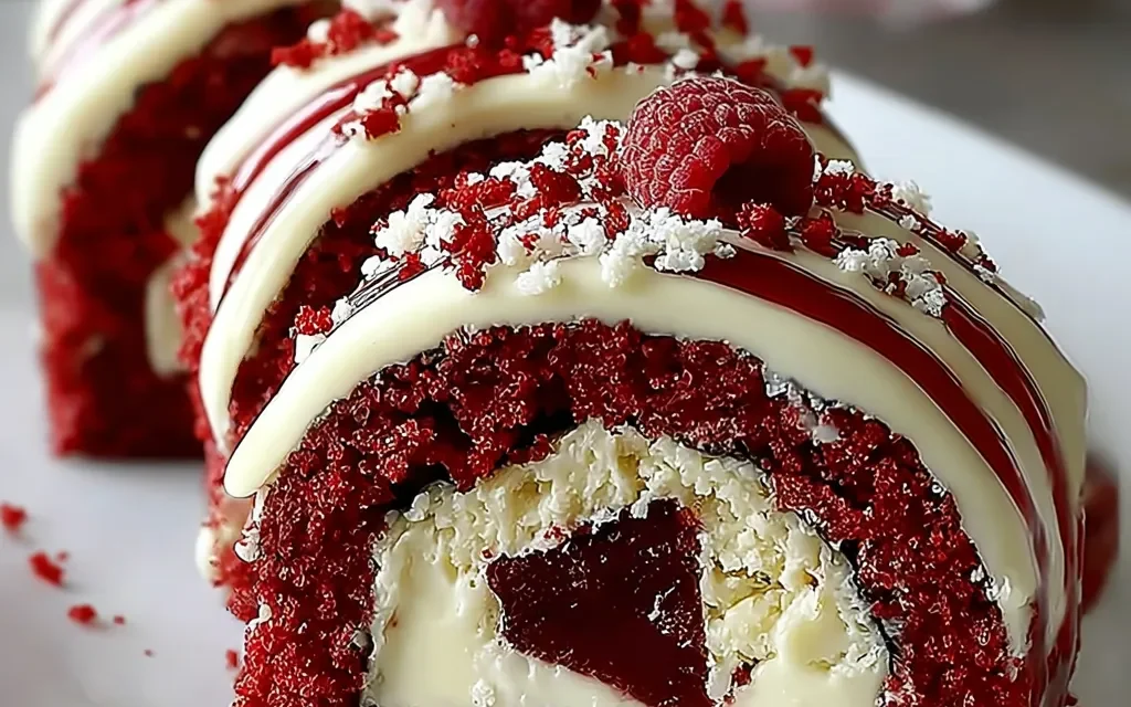 Indulge in the captivating fusion of rich red velvet cake and creamy cheesecake, wrapped up in delicate sushi rolls for a unique and delightful treat.
