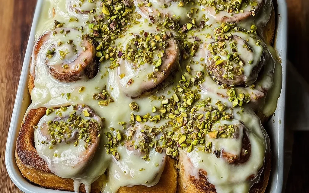 11. 11. Drizzle the pistachio cream over the warm cinnamon rolls and serve immediately.