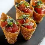 6- Serve the Spicy Tuna Sesame Miso Cones immediately, while the cones are still crisp and the filling is chilled.