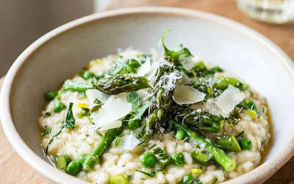 For make-ahead convenience, you can prepare the risotto base (the rice, broth, and sautéed vegetables) up to 3 days in advance and store it in the refrigerator. When you’re ready to serve, simply reheat the base, then stir in the peas, asparagus, Parmesan, and parsley just before serving.
