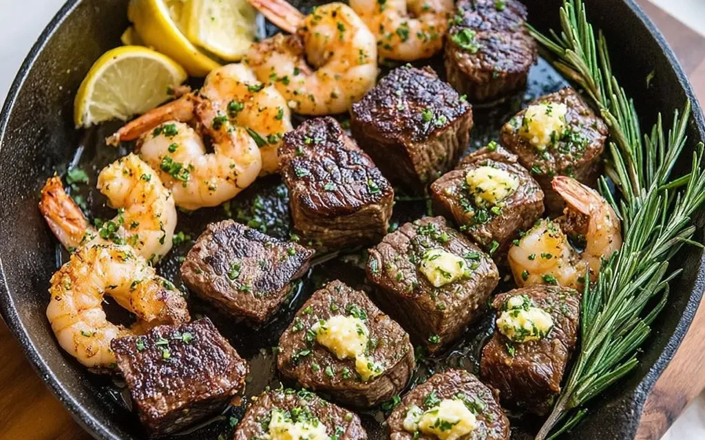 Preparing this Surf and Turf Steak Bites with Garlic Butter recipe is a breeze, with a total time of just 30 minutes. You’ll need a large skillet or cast-iron pan, a cutting board, and a sharp knife to get started.